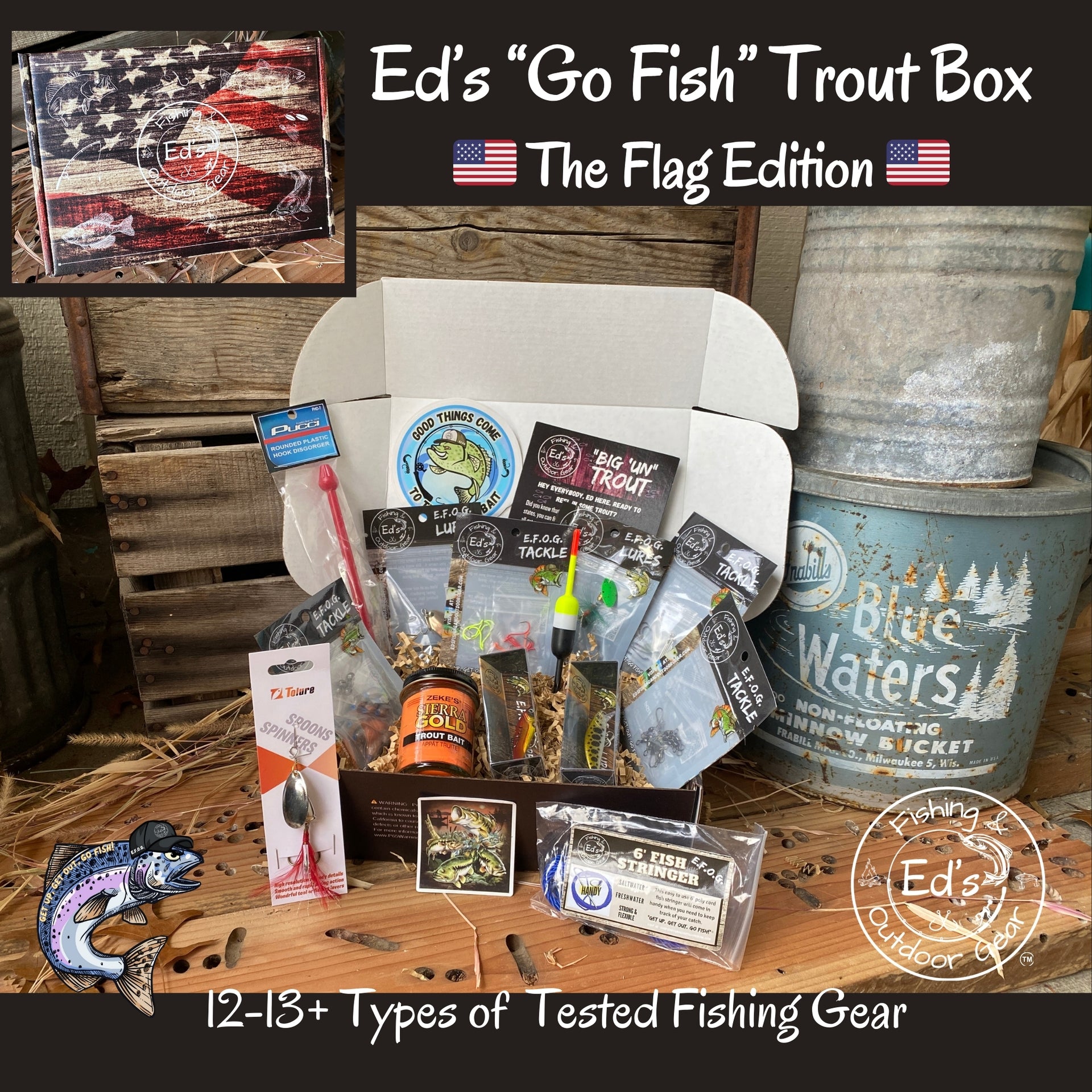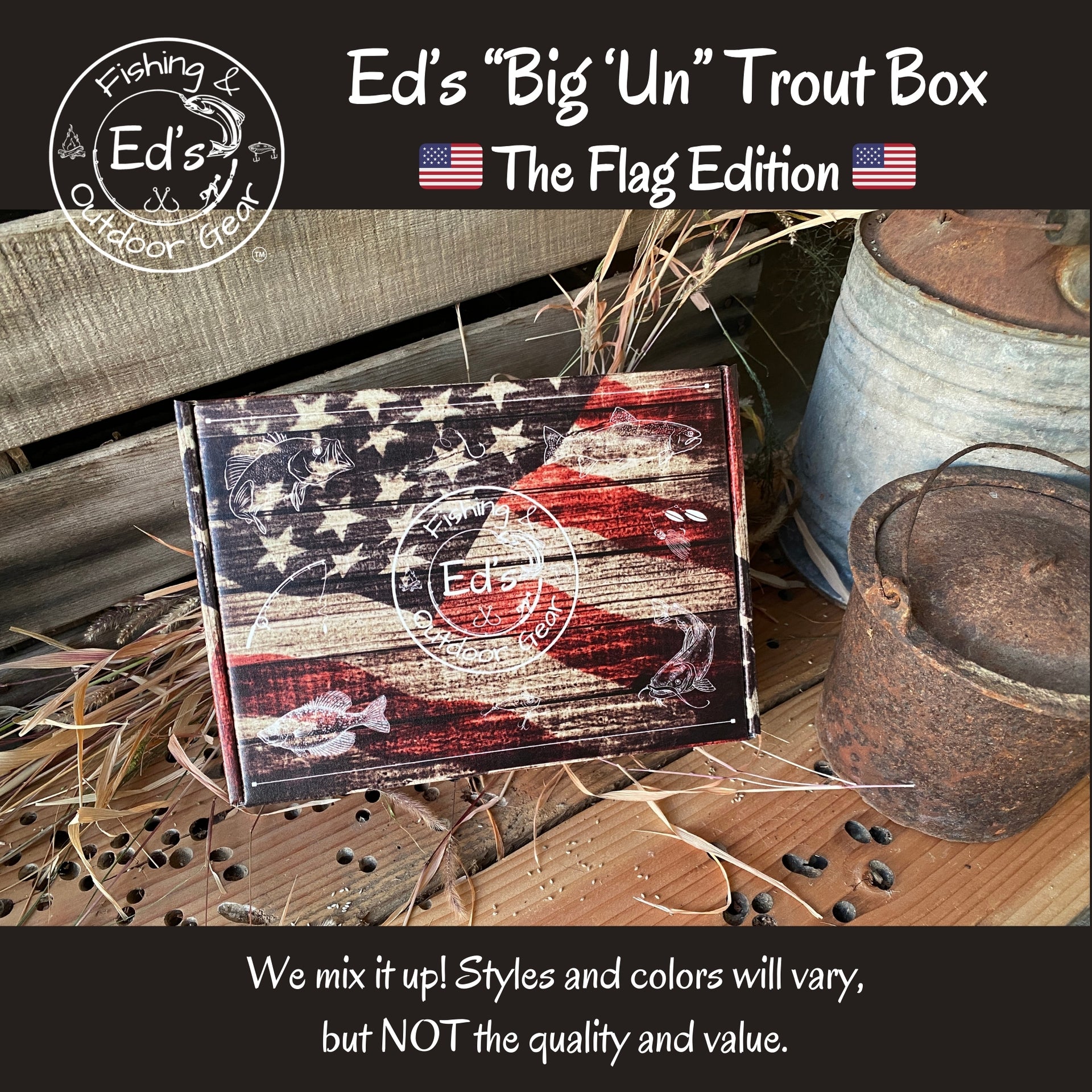 The "Big 'Un" Trout box, with 12-13+ pieces and a $60+ value, has a great selection of gear and bait for any trout angler. And like most of our other boxes, it also comes in an American flag themed box.